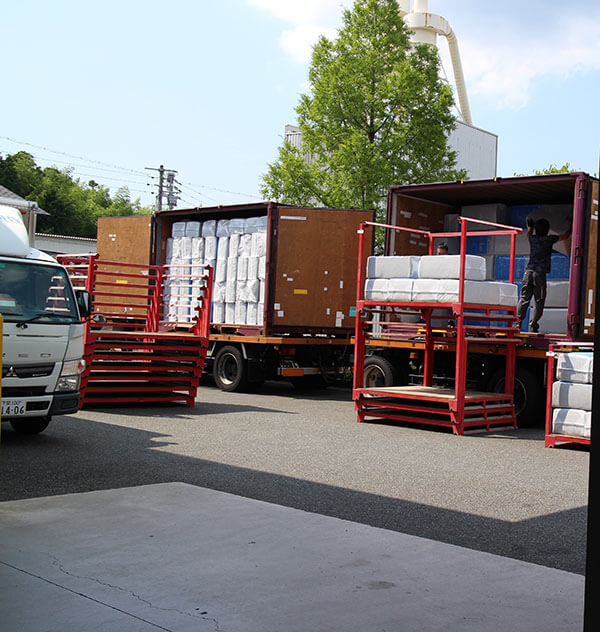 この画像の積載の仕方にも工夫があります。一度デコスファイバーの袋をフレームから取り出し、荷台に隙間なく詰めることで一回の輸送を無駄なく活用しています。デコスは、手間がかかっても自然環境のために、住み手の居心地の良さと健康のために、改善を続けています。
